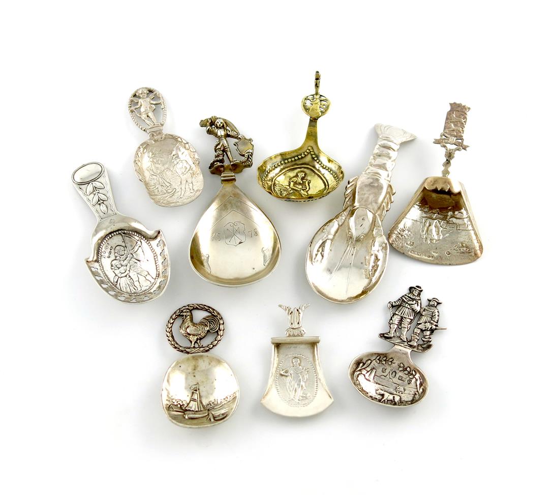 comprising: one modelled as a lobster, by Neresheimer of Hanau, with import marks for London 1912, importer's mark of B. Muller, plus another by the same maker with a cockerel finial, plus six various others and an English silver-gilt spoon with a figural terminal, London 1891, approx. total weight 6.7oz. (9)