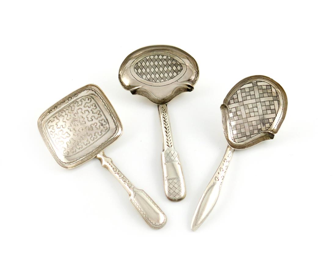 the rounded square bowl with wriggle-work decoration, plus a George III silver caddy spoon by William Pugh, Birmingham 1814, the bowl with chequer board decoration, and another one by William Pugh, Birmingham 1812, approx. weight 0.7oz. (3)