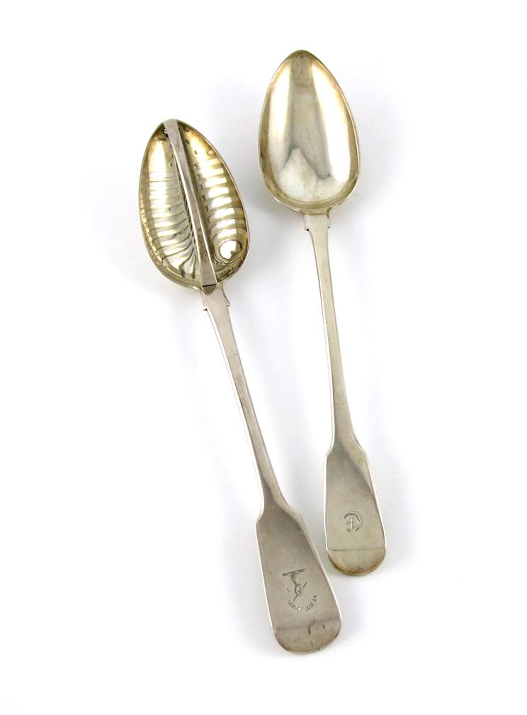 the bowl with a detachable strainer, the terminal with a crest, plus a Fiddle pattern basting spoon, by Richard Crossley, London 1805, approx. total weight 8.5oz. (2)
