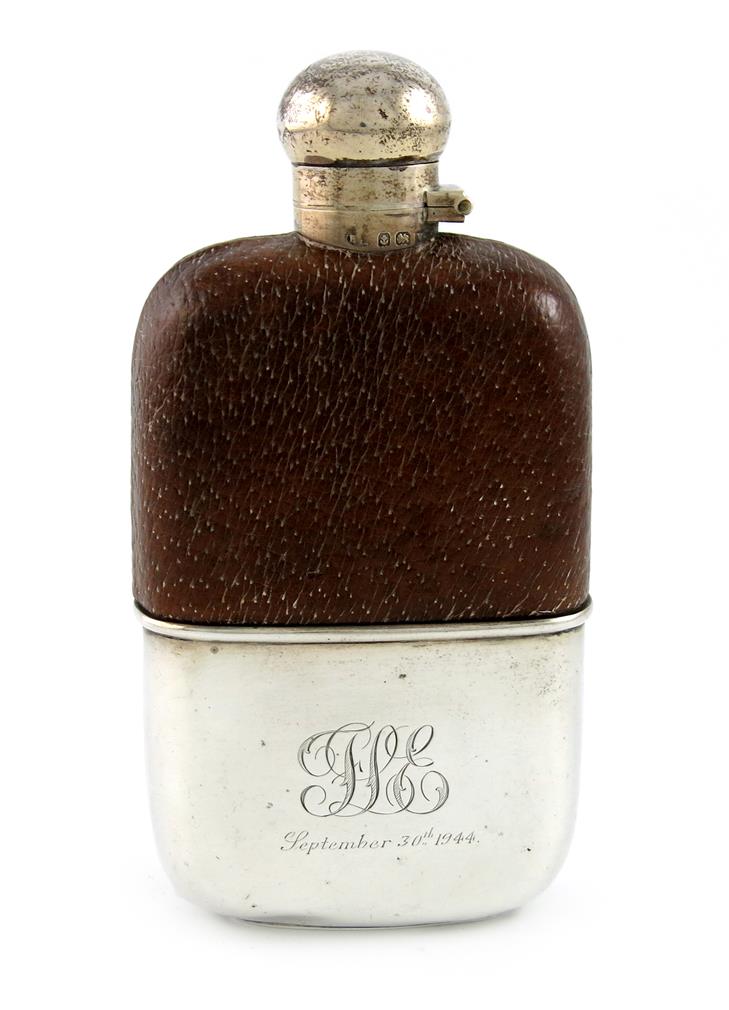 A silver-mounted leather hip flask,
