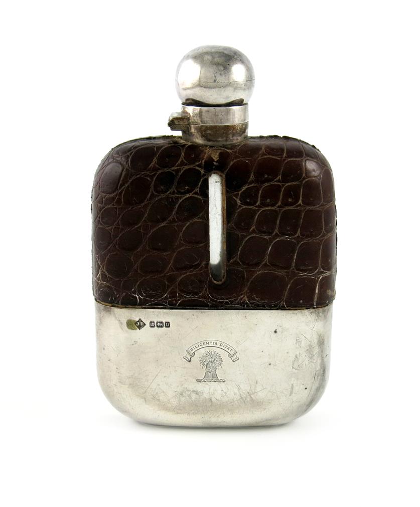 rounded rectangular form, the pull-off drinking cup with a crest and initials, bayonet fitting cover, length 16.5cm.