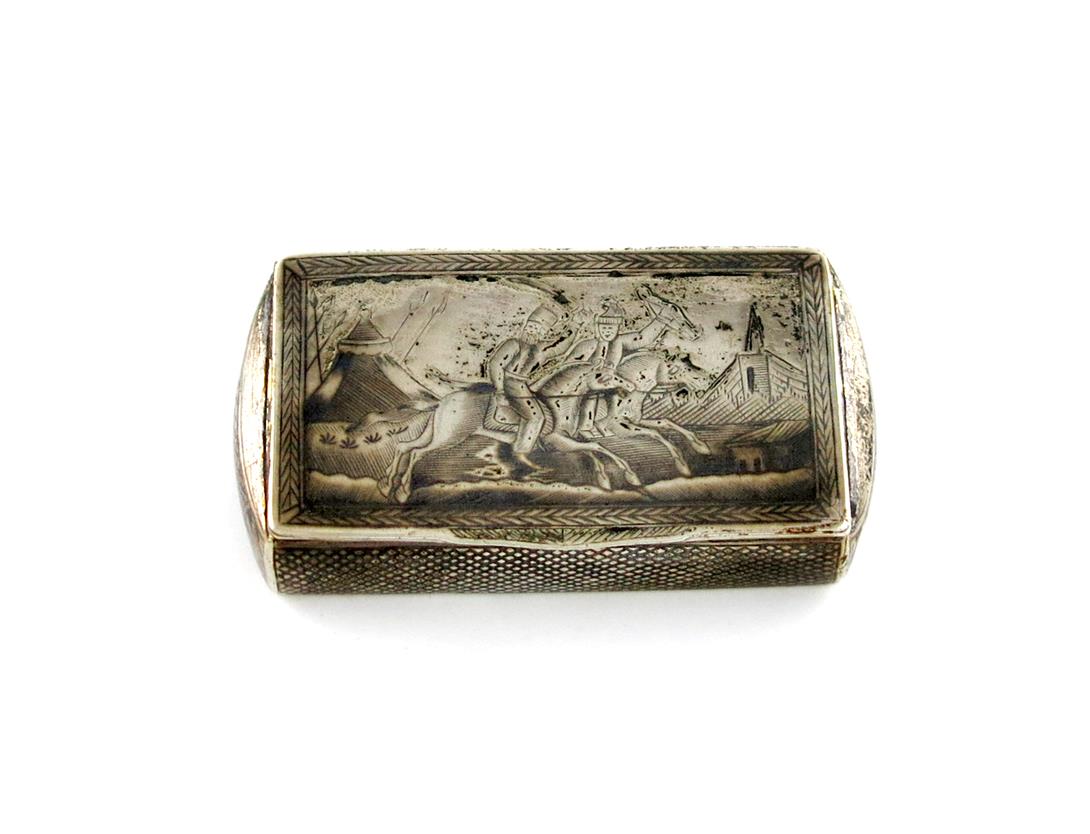 rectangular form, the cover with two horses and riders, the base with a port scene, the sides with trellis decoration, length 8cm, approx. weight 2.4oz.