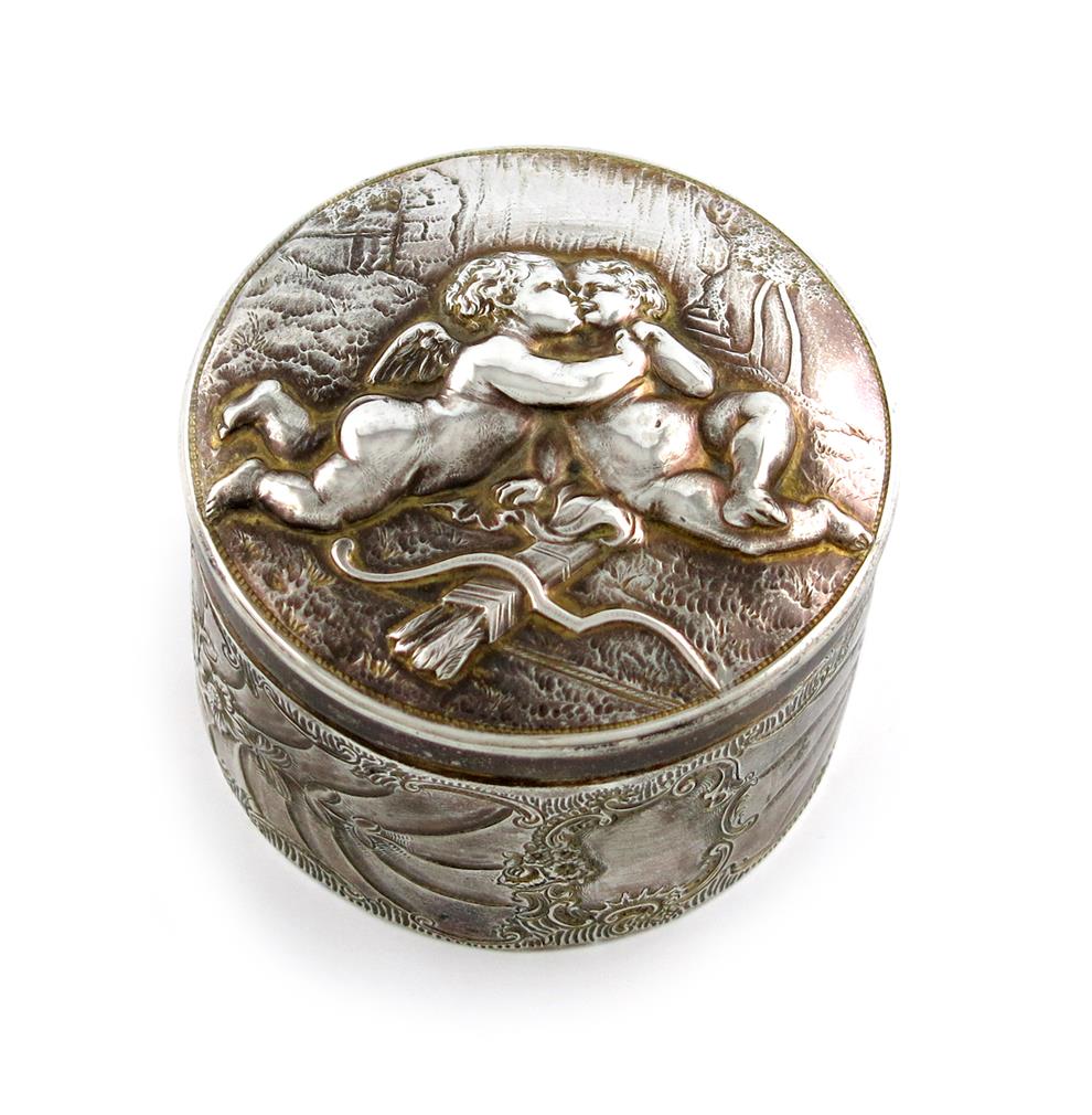 circular form, the cover embossed with two amorous cherubs, the sides with foliate decoration, diameter 6.8cm, approx. weight 3.3oz.
