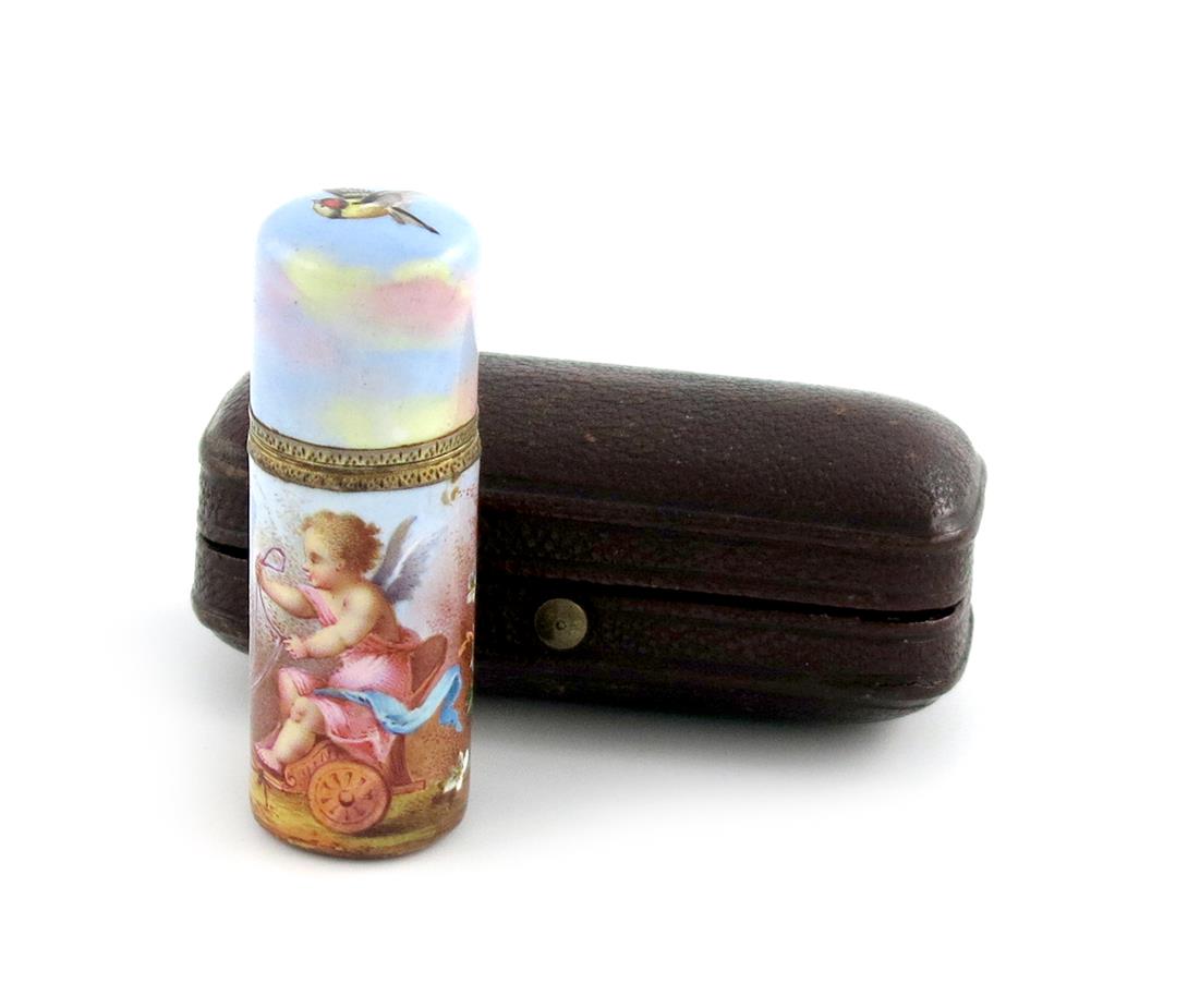 cylindrical form, decorated with a cherub and birds in a landscape, in a fitted case, length 5.6cm.