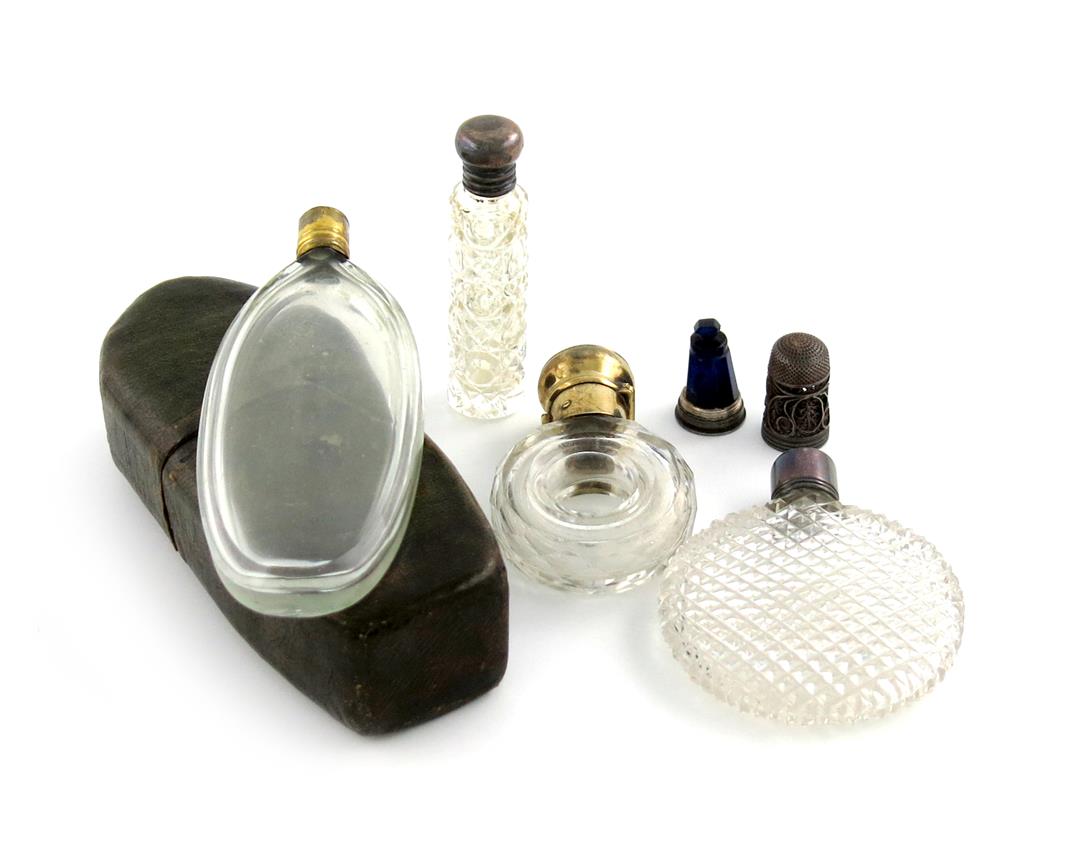 comprising: a George III silver thimble scent bottle, unmarked, probably Birmingham made, circa 1800, the screw-off thimble with filigree scroll decoration, the base mounted with a miniature blue glass scent bottle, plus a silver-gilt mounted ring scent bottle, a cased scent bottle and two further scent bottles. (5)