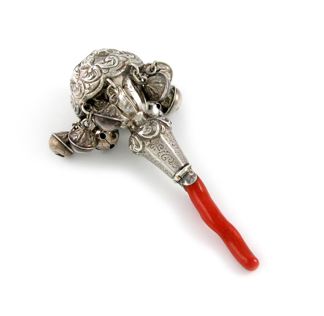 baluster form, with eight bells, and a coral teether, some repair and lacking whistle, length 11.3cm.