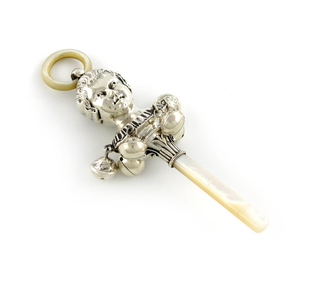 baluster form, embossed with two child's heads, six bells, and with a mother-of-pearl handle and teething ring, length 15m, approx. weight 1.6oz.