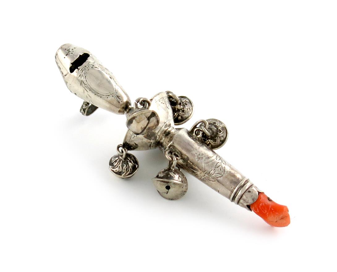 λA George III silver baby's rattle and whistle