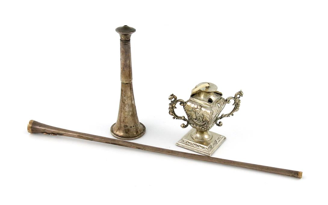 comprising: a late-Victorian candle extinguisher, by George Dibdin, London 1898, of hunting horn form, applied with a crowned initial, plus a table cigar lighter modelled as a hunting horn, London 1935, and a table cigar lighter of square baluster form, embossed with classical figures, London 1901. (3)