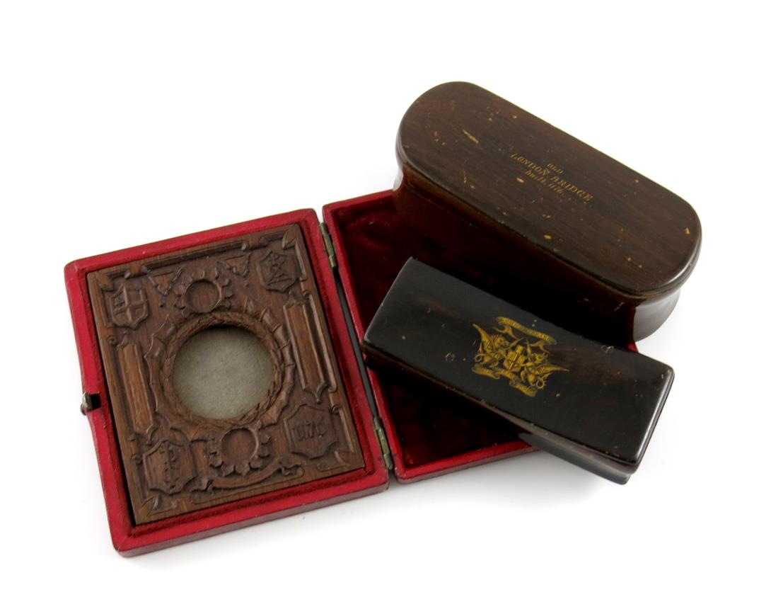 the frame of rectangular form, with carved decoration and armorials and dated '1176', in a fitted case, length 10cm, one snuff box of rounded rectangular form, the cover inscribed 'Old London Bridge, built 1176', and one of rectangular form, the cover with the arms of the City of London and 'London Bridge'. (3)