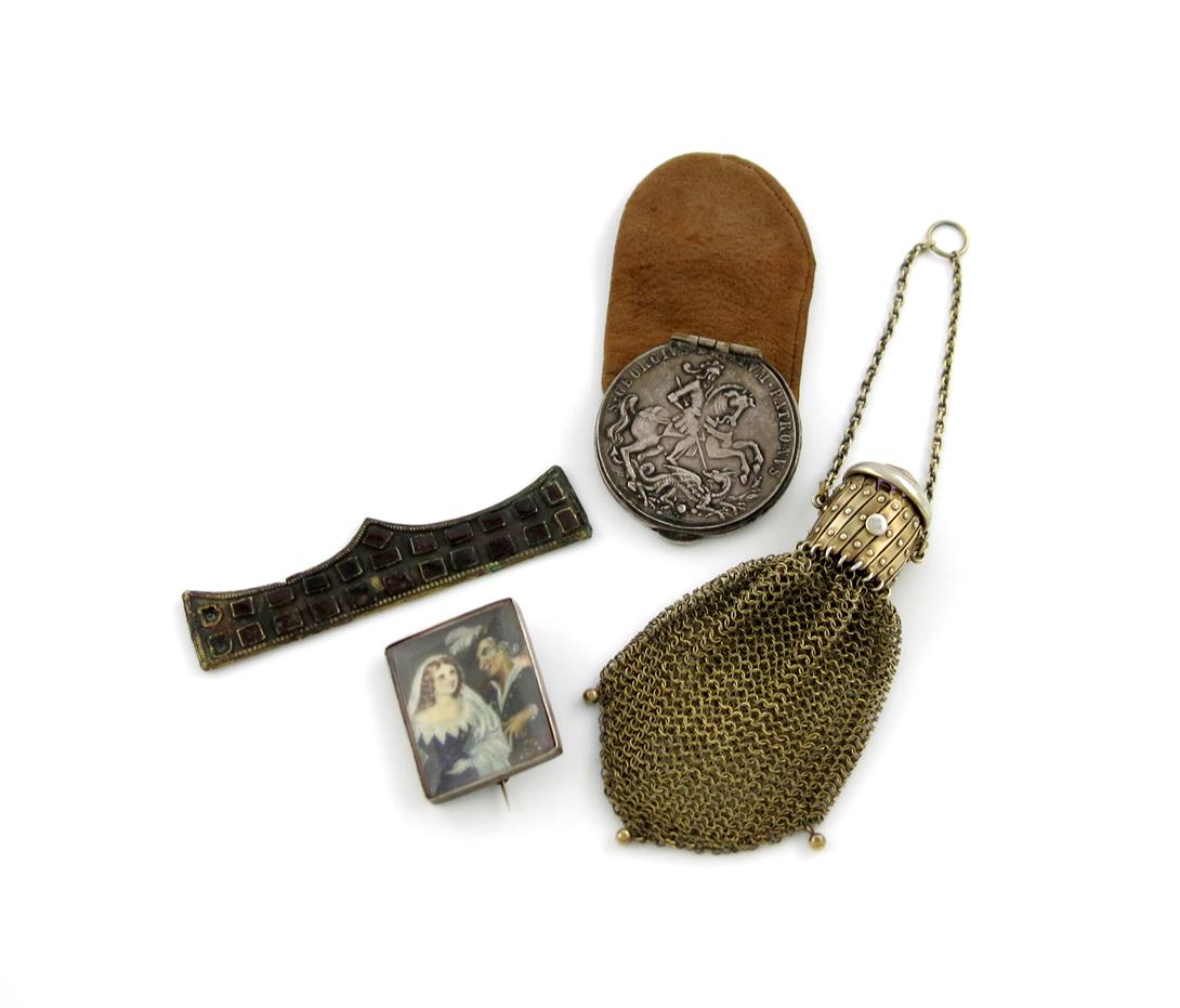 comprising: a silver-gilt mesh purse, with a concertina closing neck, and with a purple finial and chain attachment, plus a silver and suede purse, the cover formed with a coin, and a small rectangular portrait miniature of a lady and gentleman, and a small pediment set with garnets. (4)