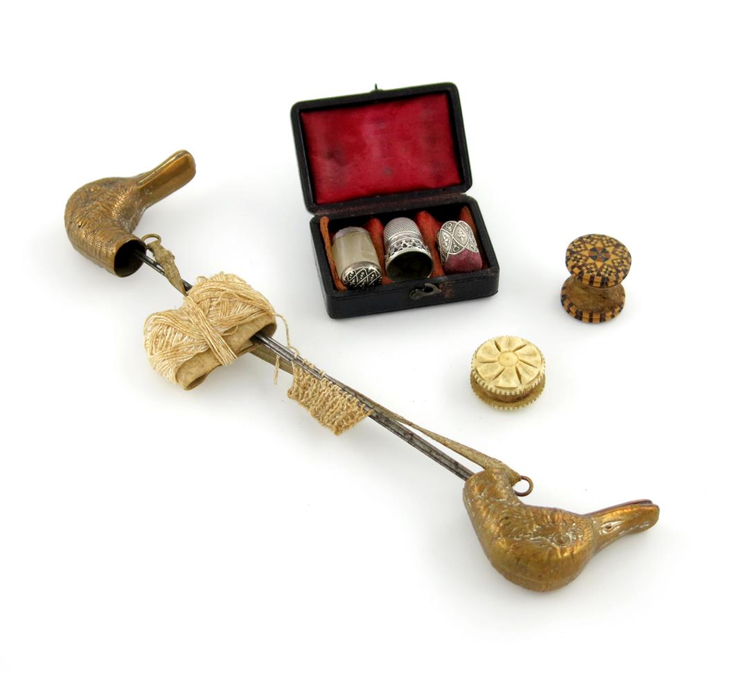 comprising: a pair of brass knitting needle covers, modelled as duck heads, a cased silver thimble, pin cushion and waxer, plus a Tunbridgeware pin cushion and an ivory pin wheel. (7)
