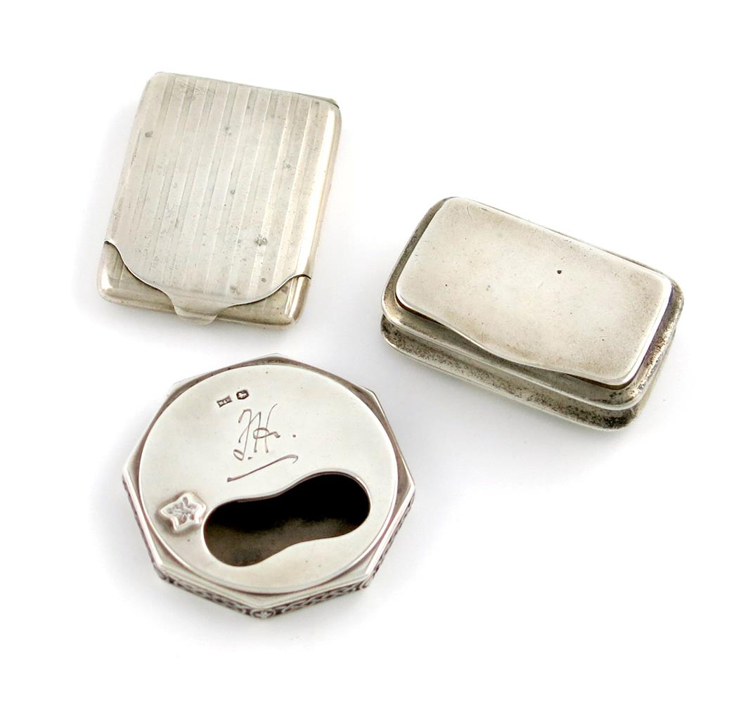 octagonal form, with a revolving cover with a leaf thumb-piece, initialled, plus a George III snuff box, Birmingham 1811, plain rectangular form, and a match box cover, approx. weight 4.7oz. (3)