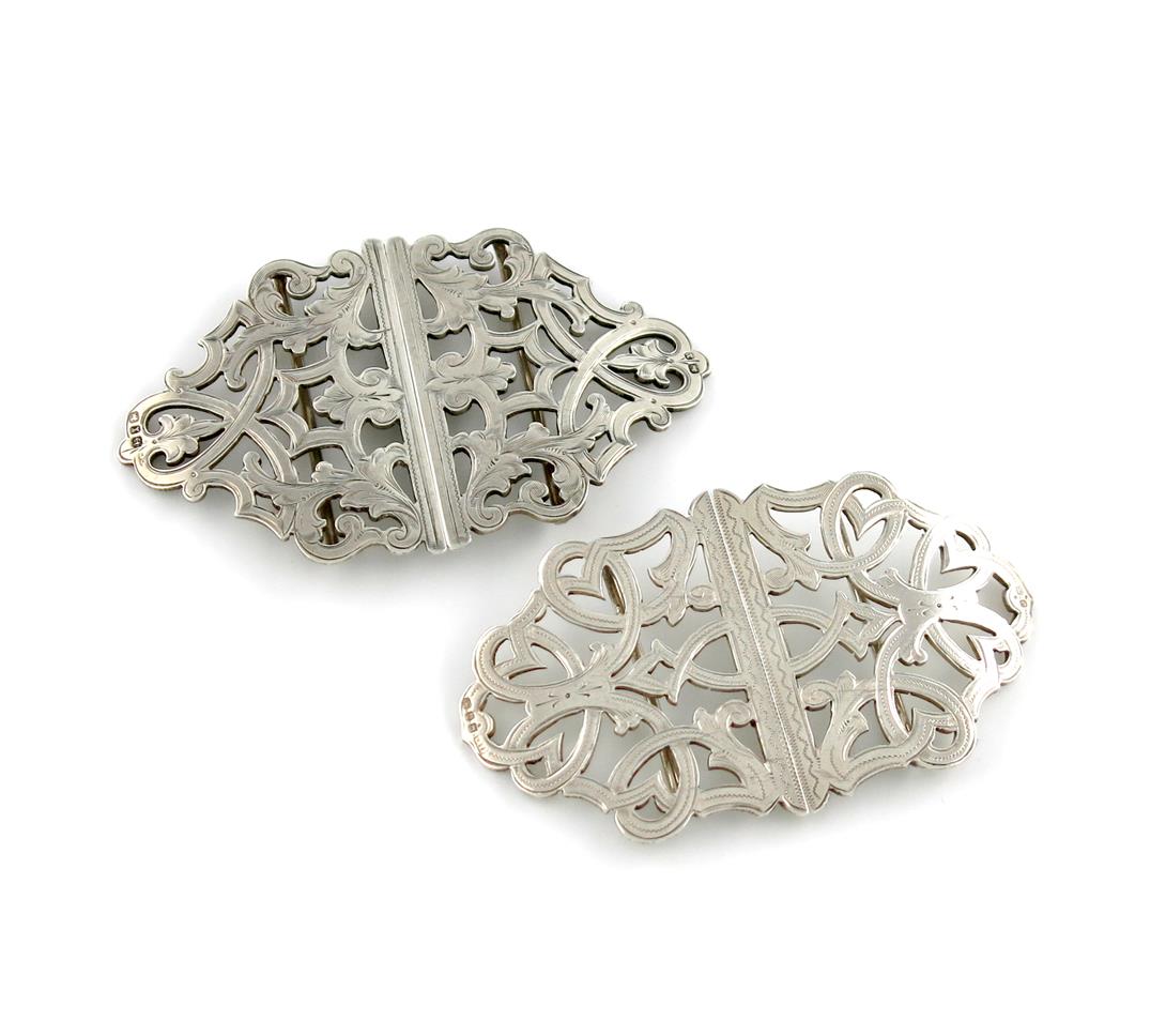 pierced and engraved decoration, plus another Victorian silver nurse's buckle, by C. Cheshire, Birmingham 1897, pierced and engraved decoration, approx. weight 3.6oz. (2)