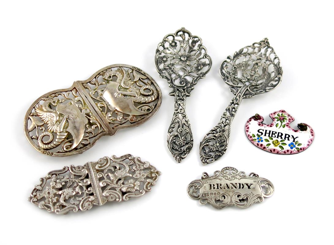 comprising silver items: an Edwardian buckle, by William Hutton and Sons Limited, London 1901, the two sections cast with a dragon holding a shield with scroll decoration, length 11cm, plus two pierced spoons, a wine label pierced 'BRANDY', another belt buckle, Birmingham 1898, and an enamelled wine label titled 'SHERRY', approx. weighable 5.5oz. (6)