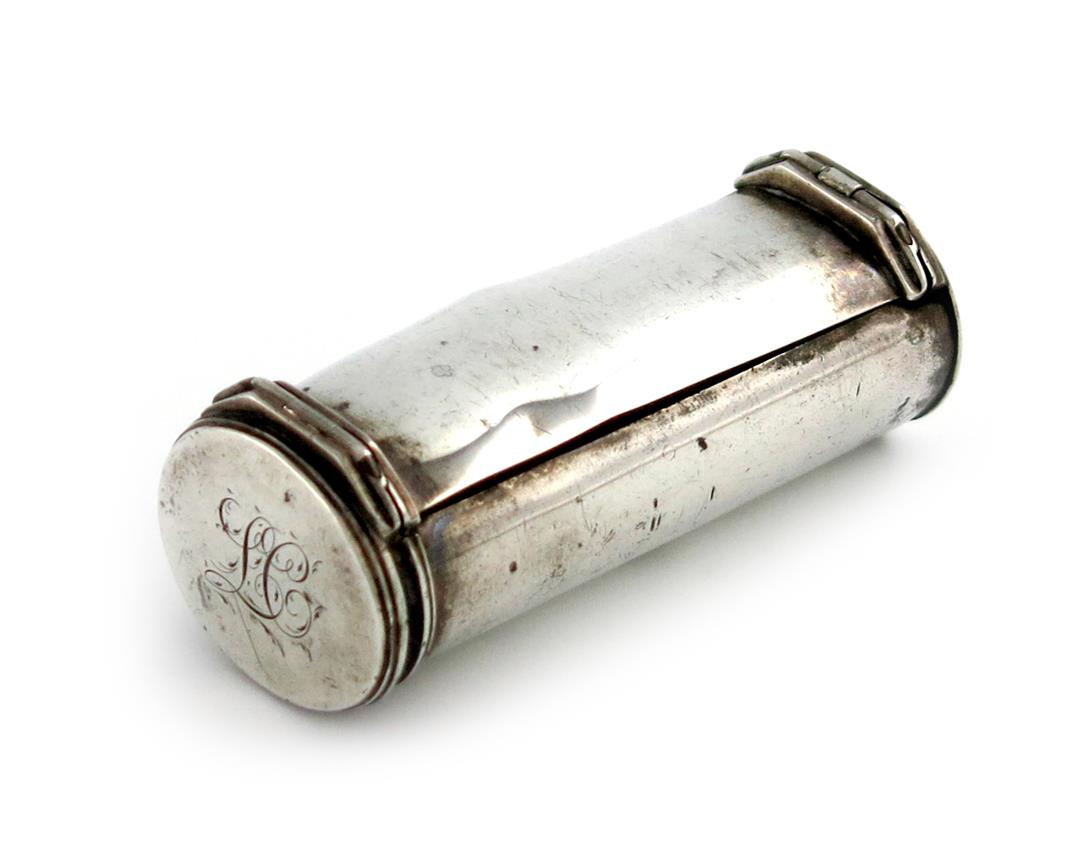 cylindrical form, hinged cover initialled, the hinged side opens to reveal the grater, length 6.8cm, approx. weight 1.6oz.