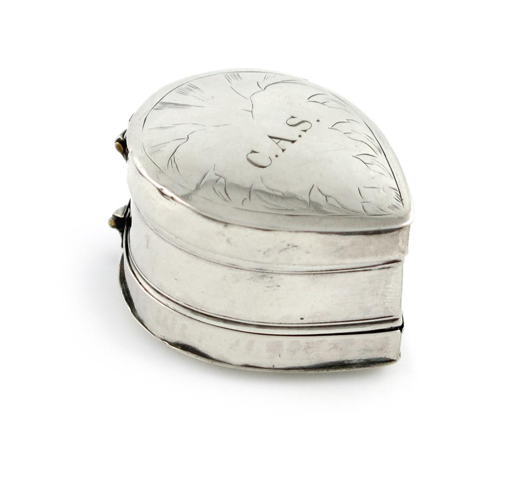 plain tear drop form, hinged cover and base, with engraved decoration, the cover later initialled 'C.A.S', length 4cm, approx. weight 0.7oz.