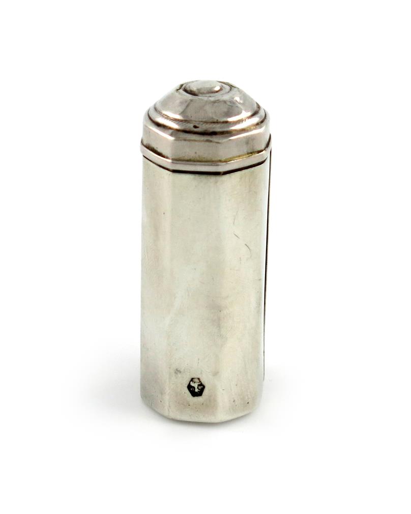octagonal tubular form, hinged side and domed cover, the side opens to reveal the grater, length 6.3cm, approx. weight 0.9oz.