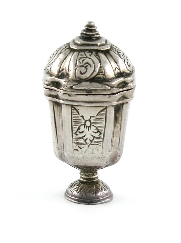 shaped urn form, chased decoration, hinged cover, on a raised circular foot, with a pull-out grater, height 4.8cm, approx. weight 0.8oz.