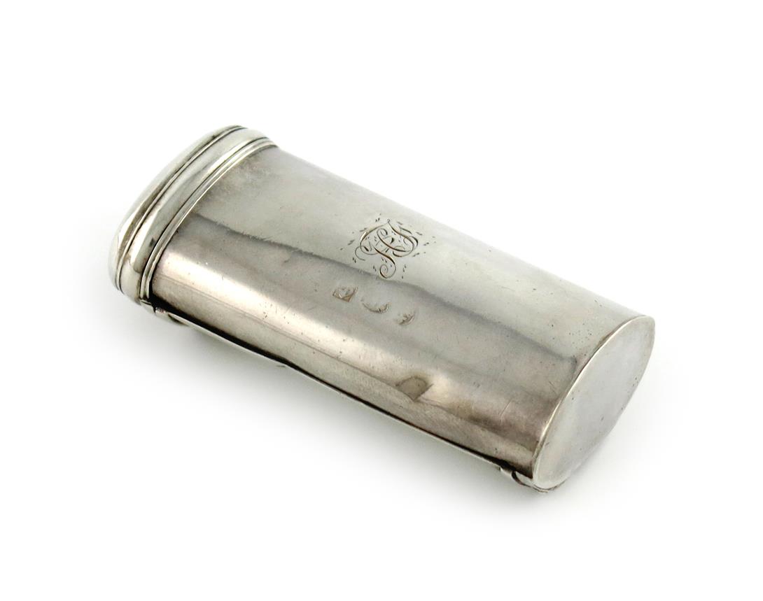 oval tubular form, hinged cover and side, the side opens to reveal the grater, the body with initials, length 6.6cm.
