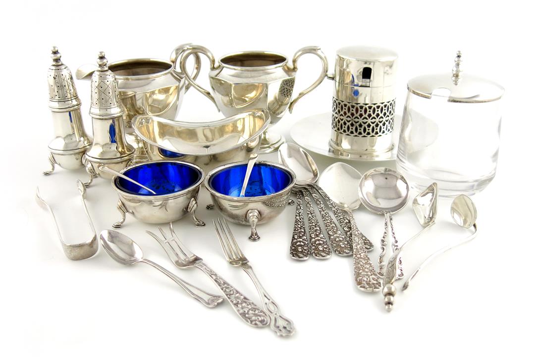 comprising: a jam pot and cover with a spoon, by USA Georg Jensen INC, circular form, with a tapering bead finial, a cream jug and sugar bowl, scroll handles, a pair of pepper pots a pair of salt cellars, an oblong dish, a jam spoon, four teaspoons, a ladle, four items of flatware, plus an English toilet jar, the cover with a later cut section for a spoon and a pair of sugar tongs, approx. weighable 28oz. (qty)