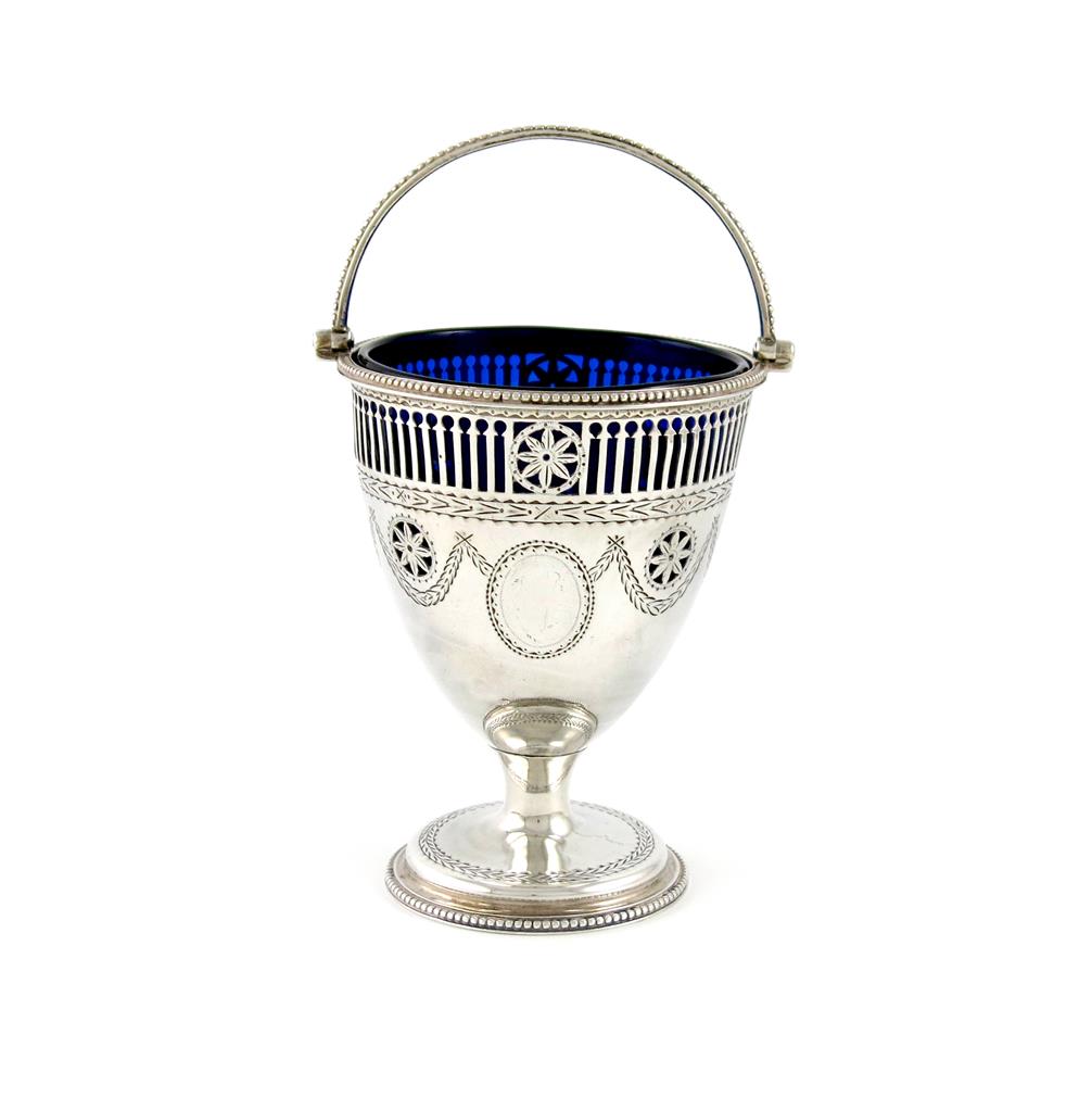 urn form, engraved with swags and medallions, with pierced decoration, beaded swing-handle and borders, on a circular foot, with a blue glass liner, height 10cm, approx. weight 3oz.
