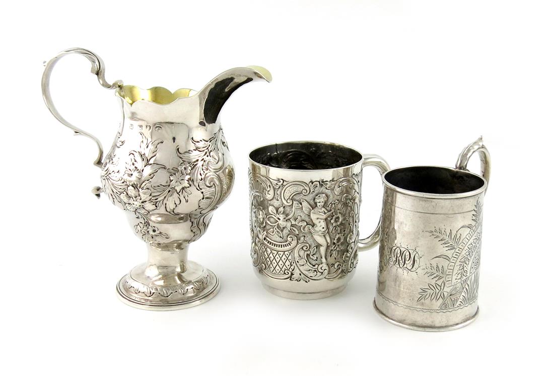 comprising: a George III cream jug, of baluster form, later decoration, by Walter Brind, London 1769, height 14.5cm, plus a silver mug by William Hutton and Sons, Birmingham 1900, and a later-Victorian mug, by Wakely and Wheeler, London 1897, approx. total weight 13.8oz. (3)