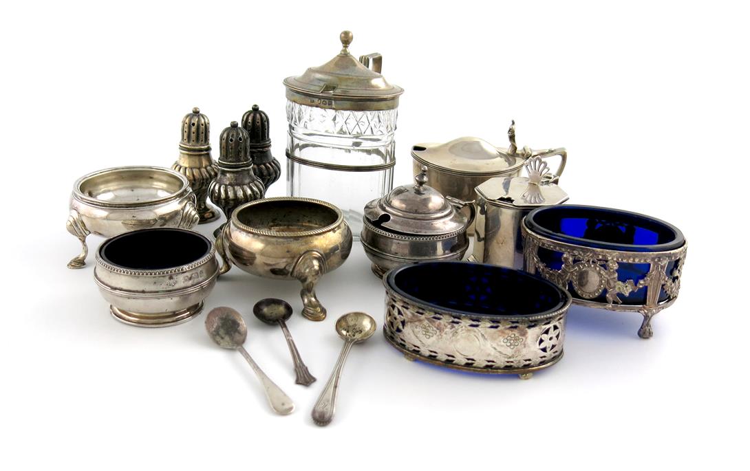 comprising: a George III silver-mounted condiment bottle, London 1807, oval form, bright-cut decoration, the hinged cover with a ball finial, plus two George II cauldron salt cellars, a set of three pepper pots, a mustard pot and salt cellar, two further mustard pots, a continental salt cellar and an old Sheffield plated salt cellar, plus three condiment spoons, approx. weighable 17oz. (qty)