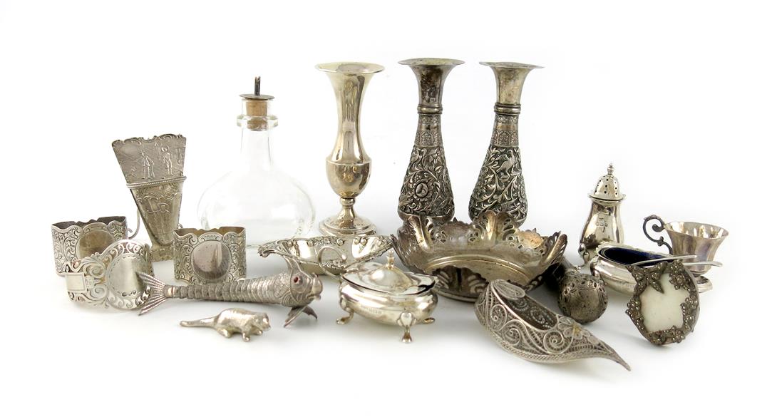 comprising: a silver flower holder, with import marks for London 1894, two bonbon dishes, a three-piece condiment set, a vase, a small cup, three napkin rings, a bitters bottle, a modern frame, a parasol handle and metalware items: a pair of vases, a filigree shoe, a fish and an electroplated otter, approx. weighable 10oz. (qty)