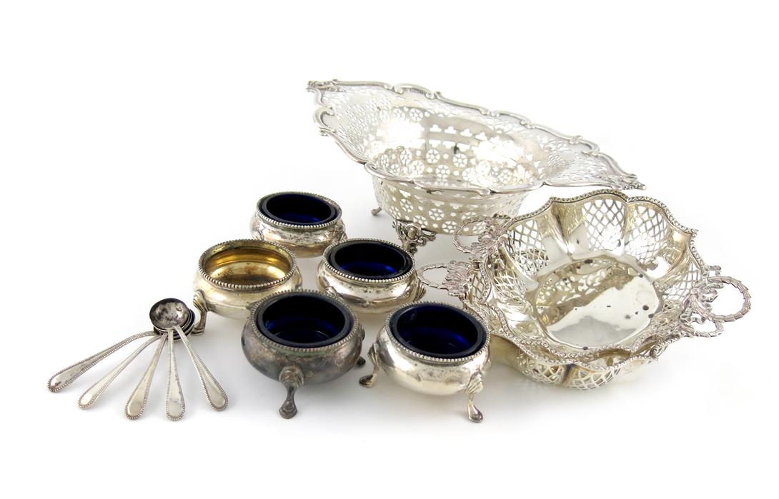 comprising: a set of five Victorian salt cellars, by Robert Harper, London 1871, with five salt spoons, a dish of pierced shaped oval form, Birmingham 1908, and a pair of pierced dishes, Birmingham 1919, approx. weight 21oz. (qty)