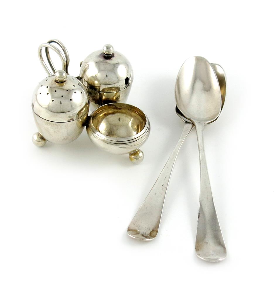 comprising: a cruet set, by F. Walters, Birmingham 1908, trefoil form, scroll handle, plus a pair of Hanoverian scroll-back tablespoons, date letter worn, approx. weight 9.4oz. (3)