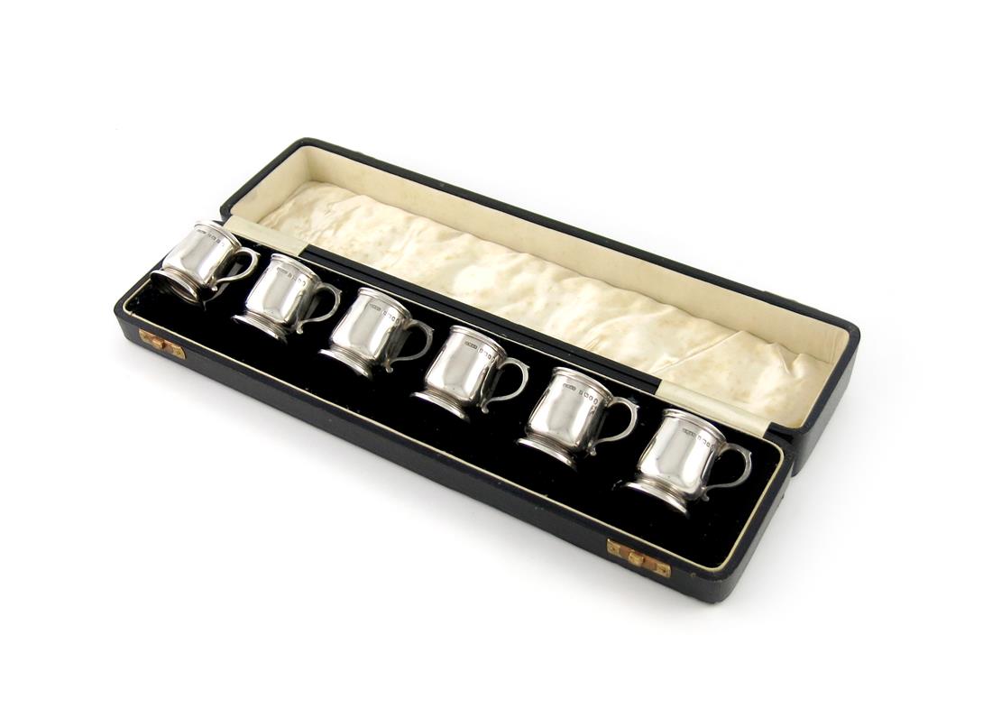 modelled as miniature mugs, scroll handles, on circular bases, in a fitted case, height 4cm, approx. weight 5.5oz. (6)