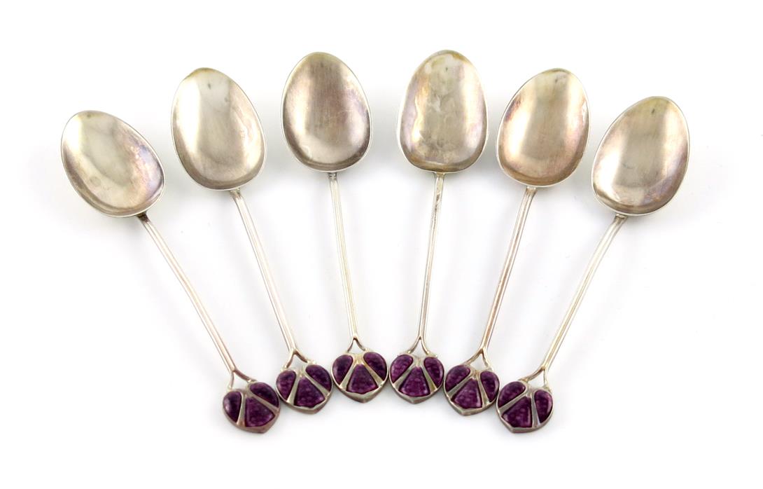 By James Fenton, a set of six Edwardian Arts and Crafts silver and enamel teaspoons,