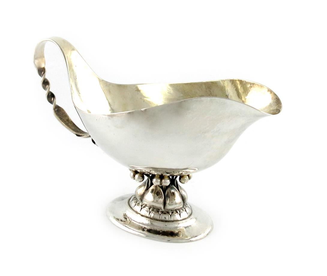 oval form, twisted scroll handle, spot-hammered decoration, on a raised oval base with bud decoration, length 24cm, height 14cm, approx. weight 13oz.