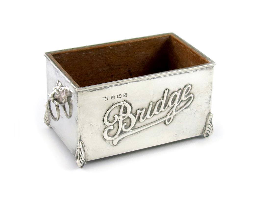rectangular form, the front applied 'Bridge', drop ring lion mask handles, length 11.5cm.
