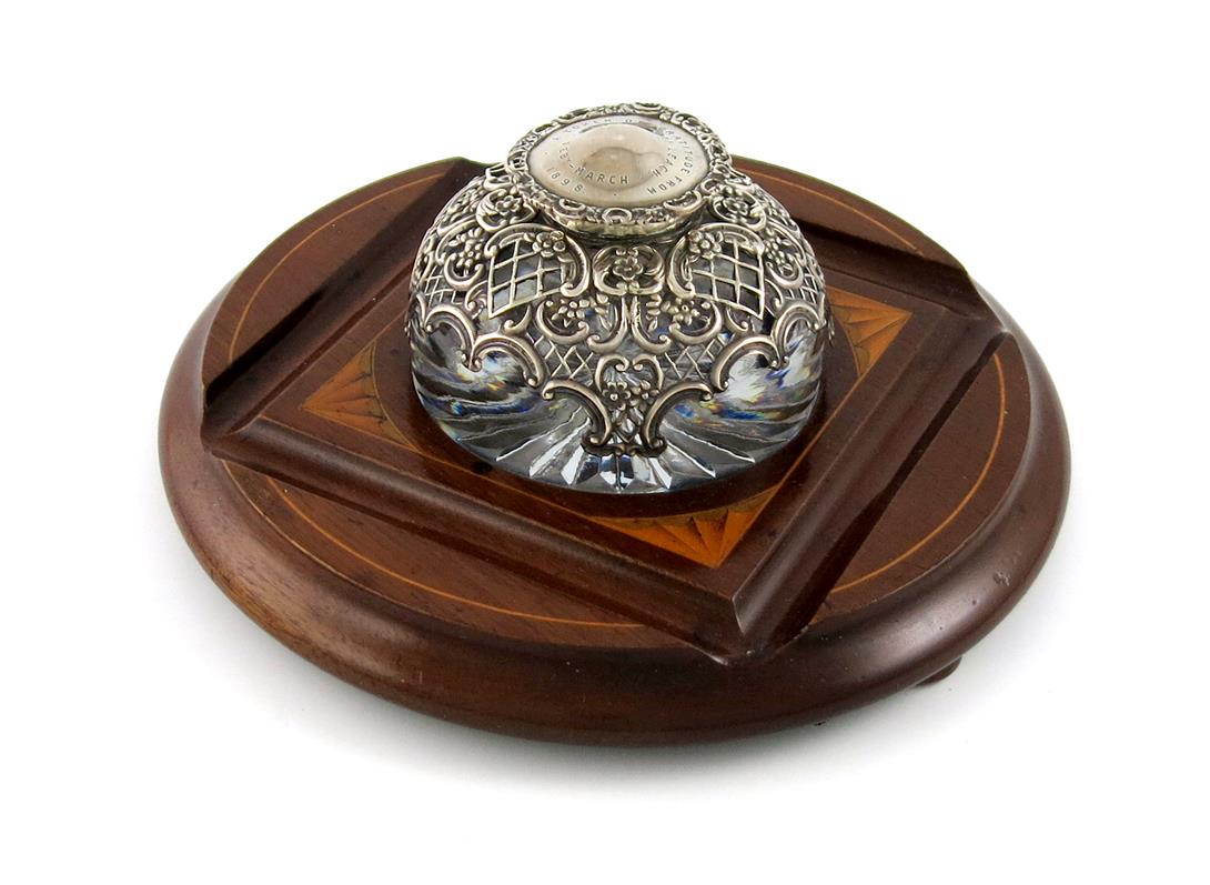 circular domed form, with foliate scroll and pierced trellis decoration, the hinged cover inscribed, on a wooden base of circular form, inlaid decoration, on three bun feet, diameter of inkwell 10cm.