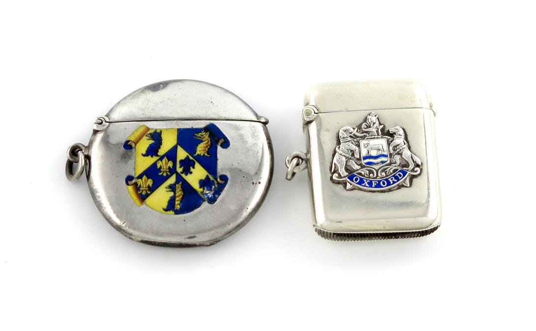 circular form, enamelled with the arms of Trinity College, Oxford, with a ring attachment, plus another silver and enamel vesta case, Birmingham 1907, with the arms of Oxford, approx. total weight 1.5oz. (2)