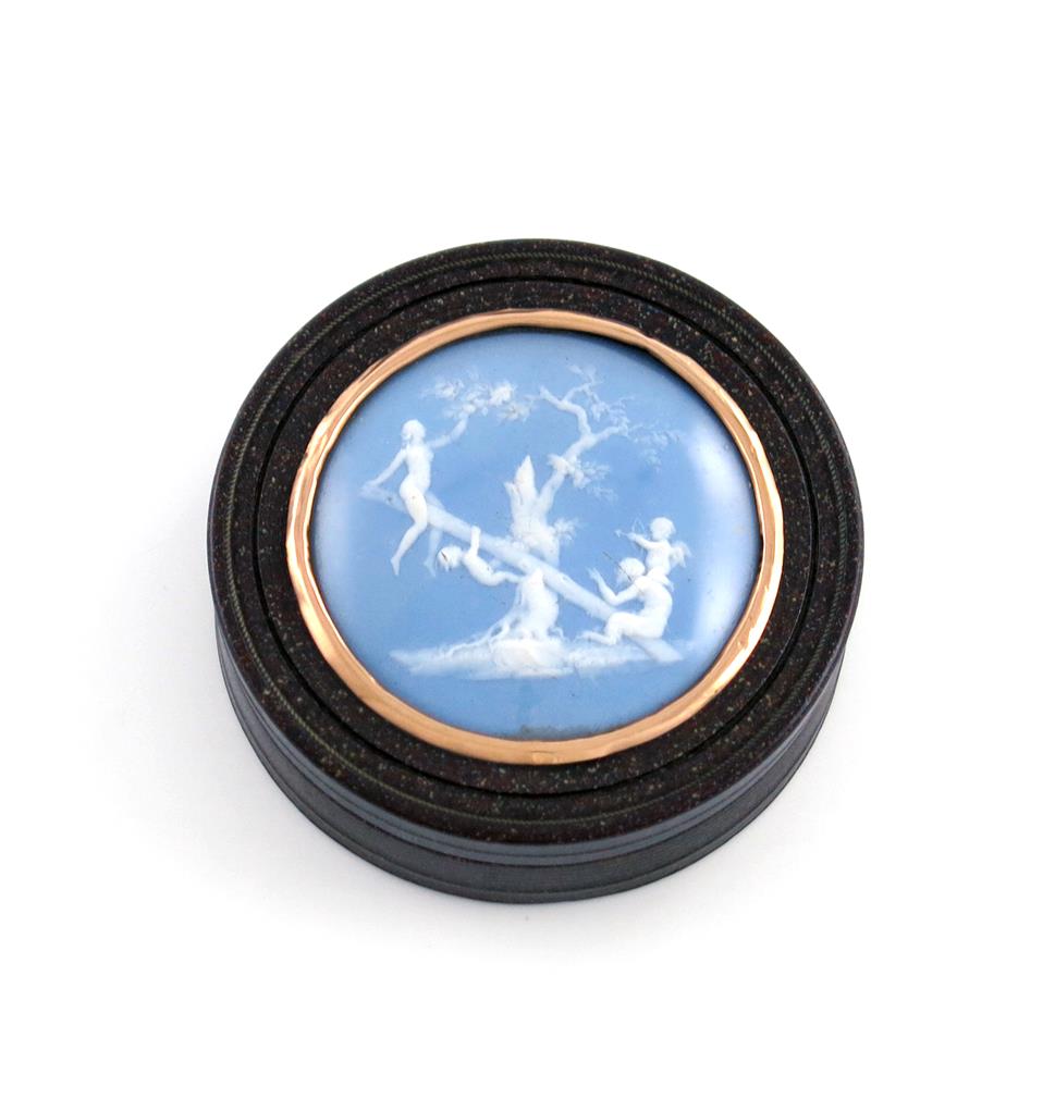 circular form, the pull-off cover inlaid with a Jasperware panel of classical figures on a see-saw, under glass with a gold band, tortoiseshell lined, diameter 7.7cm.