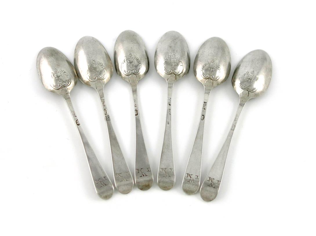 A set of six mid 18th century silver Hanoverian 'picture-back' teaspoons