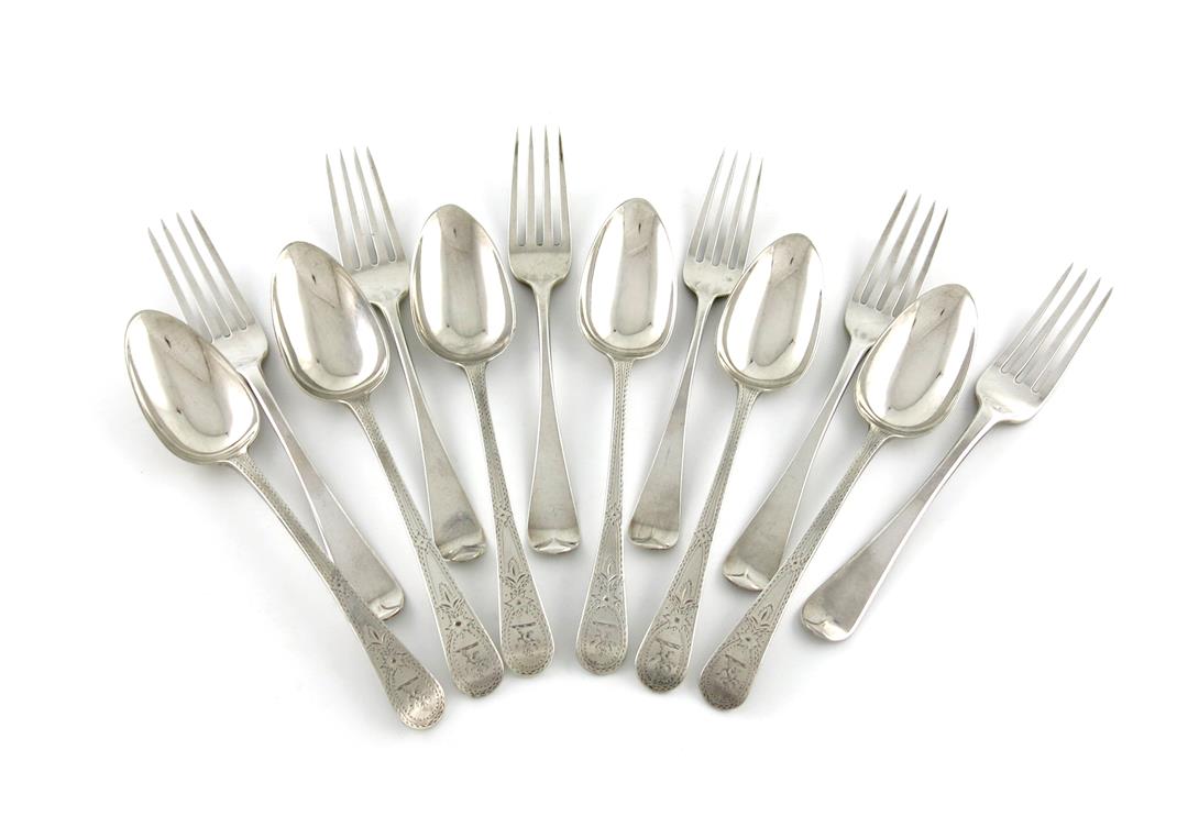 A set of six George III silver Bright-cut pattern dessert spoons,