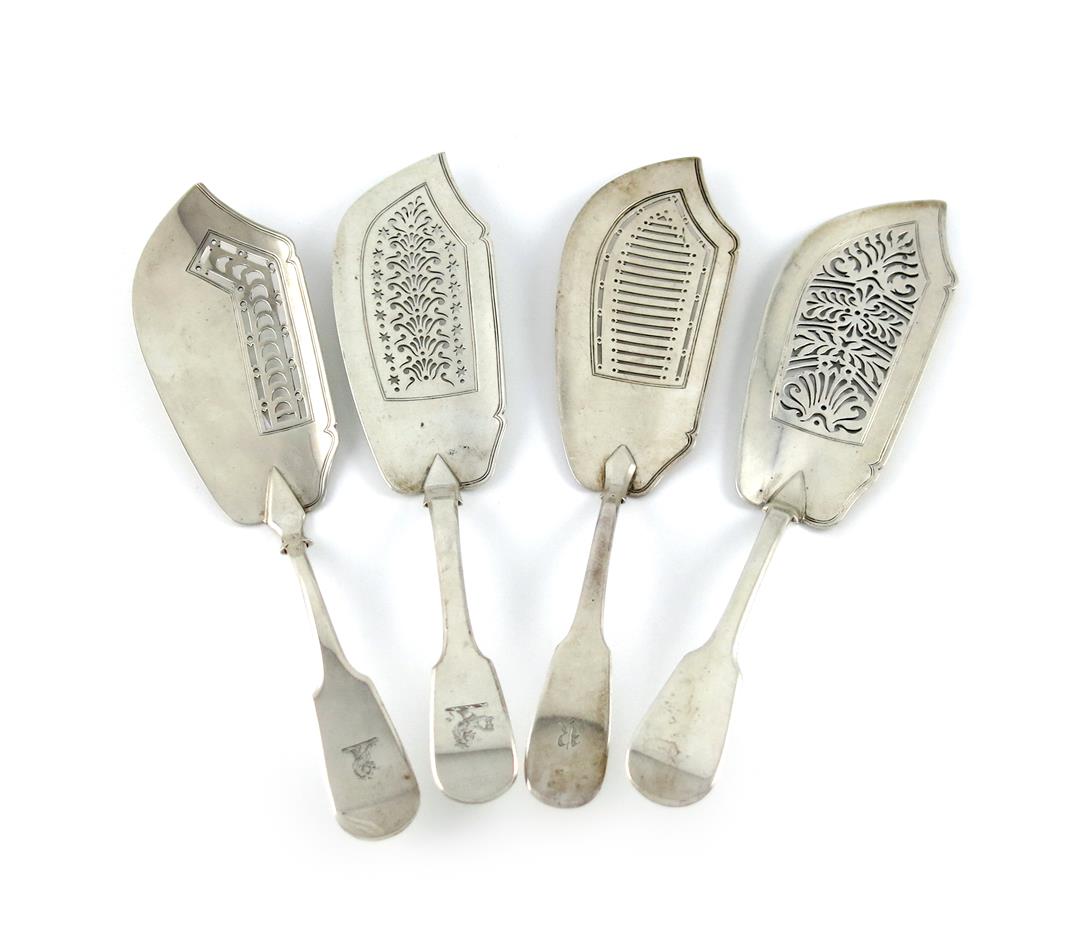 comprising: a George III one by William Welch, Exeter 1817, pierced blade, the terminal with a crest, plus three London made fish slices, London 1808 and two 1825, approx. weight 20.7oz. (4)