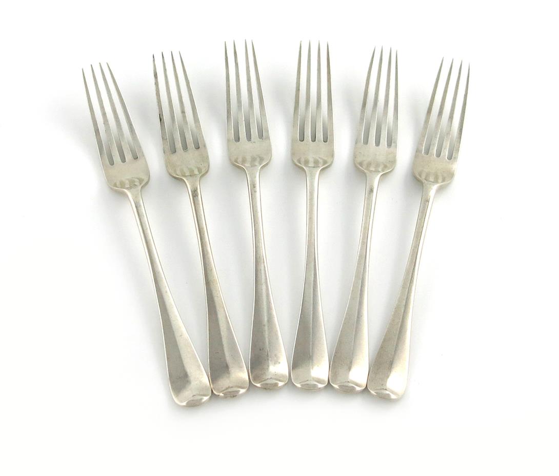 A set of six Victorian silver Hanoverian Rat-tail pattern table forks