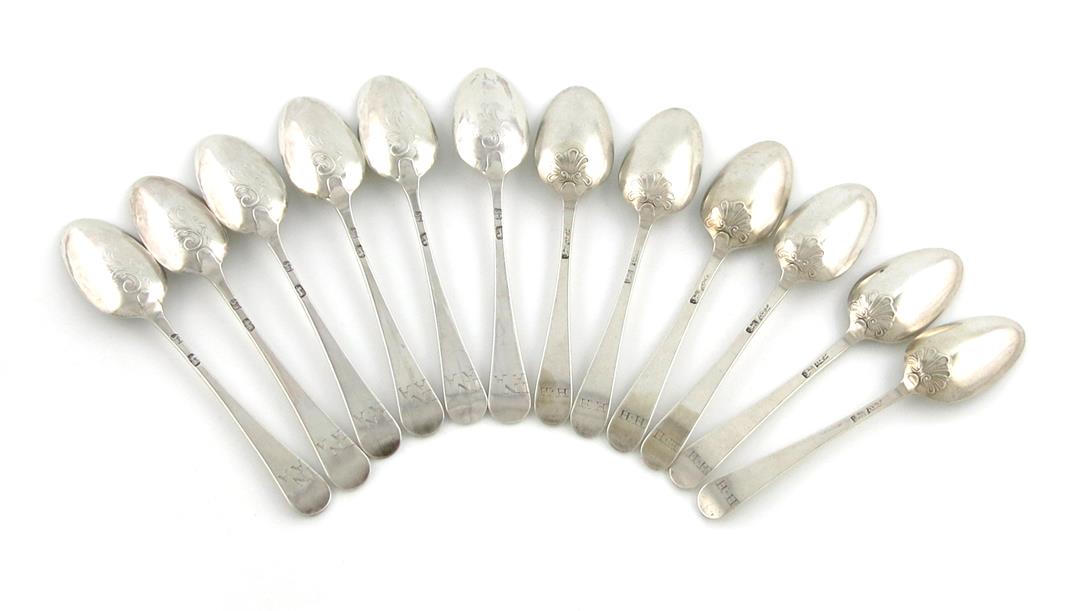 Provenance: the scroll back teaspoons purchased from Barbara Cattle, York, 23 March 1994, the shell back teaspoons, purchased from Shredds of Portobello, 18 June 1996.