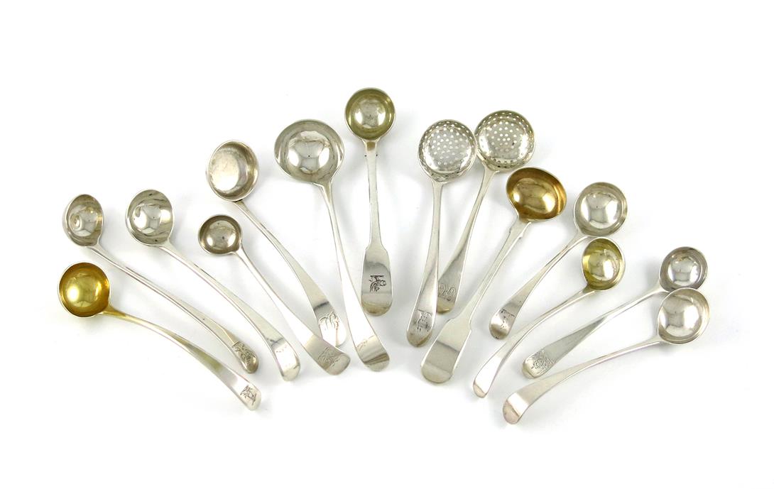 comprising: Old English and Fiddle patterns, some with gilded bowls, plus a cream ladle and two sifting ladles, with pierced bowls, approx. weight 6.8oz. (14)