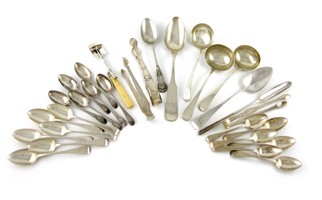 comprising: a marrow scoop, London 1765, a slide-action cheese scoop, by Samuel Pemberton, Birmingham 1814, three pairs of sugar tongs, a pair of sauce ladles, London 1803, a set of six Bright-cut teaspoons, a single sauce ladle, a tablespoon, a dessert spoon, another set of six teaspoons and six Exeter teaspoons, approx. weight 23.5oz. (qty)