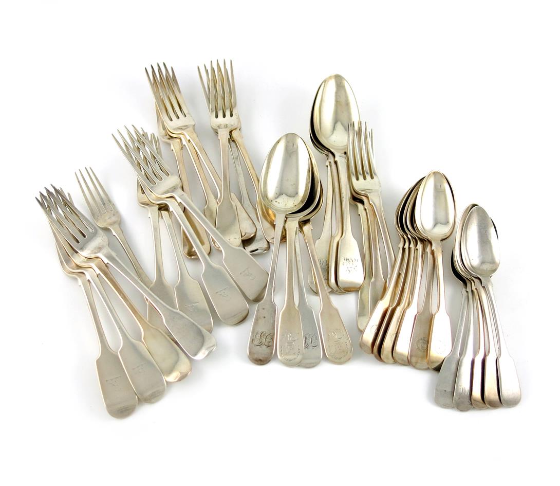 comprising: a set of six Exeter table forks, 1836 and 1838, a set of six table forks, London 1827, five further table forks, a set of six dessert spoons, London 1841, five further dessert spoons, seven tablespoons, and a dessert fork, approx. weighable 73.3oz. (qty)