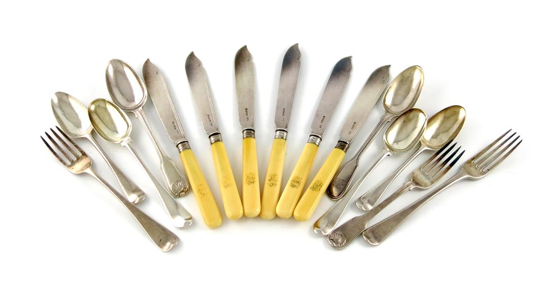 comprising: a set of six Victorian fish knives, Sheffield 1879, with ivory handles, plus a table fork, two dessert forks, and six dessert spoons, approx. weighable 13oz. (qty)