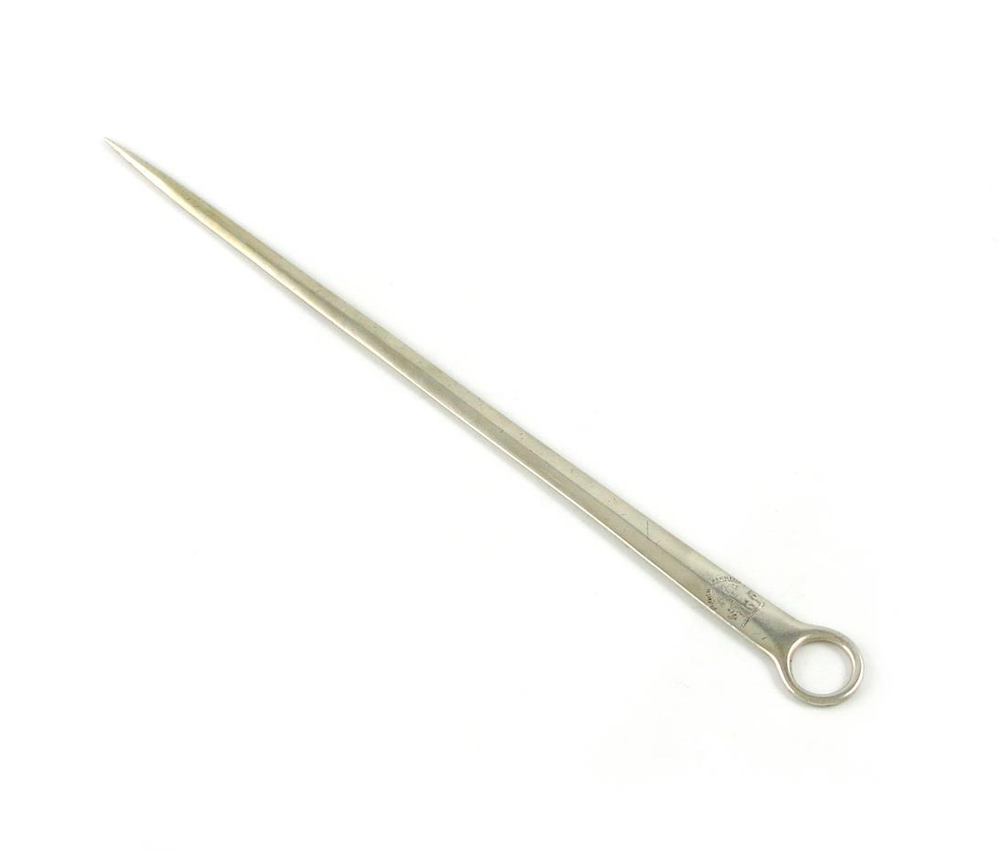 tapering form, plain ring handle, engraved with a crest, length 33.5cm, approx. weight 3oz.