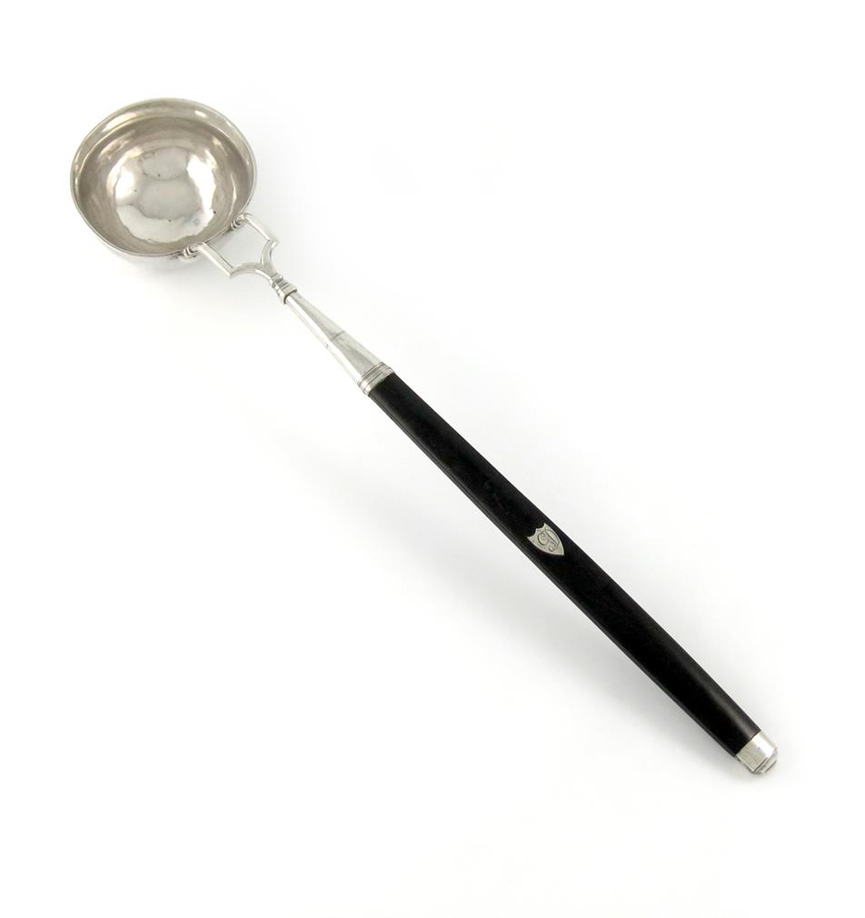 circular bowl, bifurcated mount, tapering horn handle, initialled, length 47.5cm.