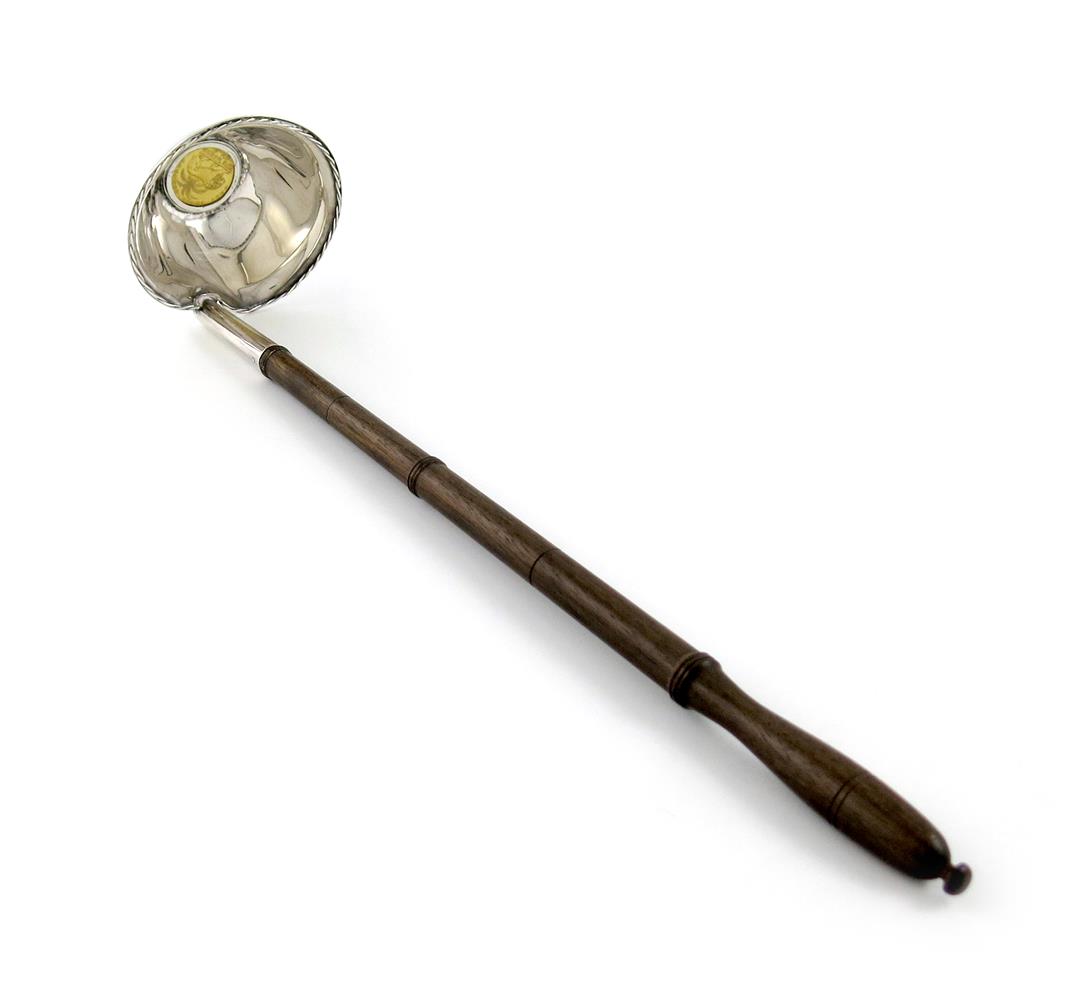 tapering circular spot-hammered bowl, rope-twist border, the base set with an 1841 gold East India Company one Mohur coin, turned wooden handle, length 34cm,
